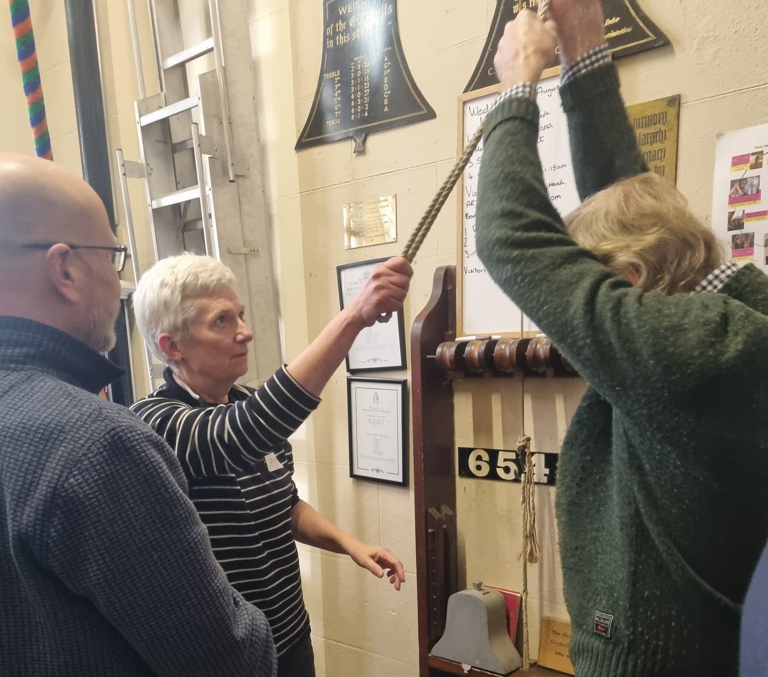 With an appropriately balanced blend of theory and practical sessions we were taken gently through the progressive steps of teaching/assisting novice bell ringers to perfect each skill component from feeling the bell, back strokes, hand strokes and transitions leading to putting both strokes together and finally ringing up and down. We worked in groups of 3, changing groups at regular intervals to work with different ringers, in order to gain experience as a ‘hands on the rope’ teacher, as an observer looking for good practice and communications and finally as a ringer . It certainly felt rather awkward not ringing full strokes and consequently led to ringing errors that had to be managed. It kept the teacher on their toes but also made the whole experience very authentic. Both David and Neil were always close at hand to offer valuable feedback at every stage thereby developing our practice and awareness and leading to a feeling of greater confidence , control, and dare I say it, expertise!